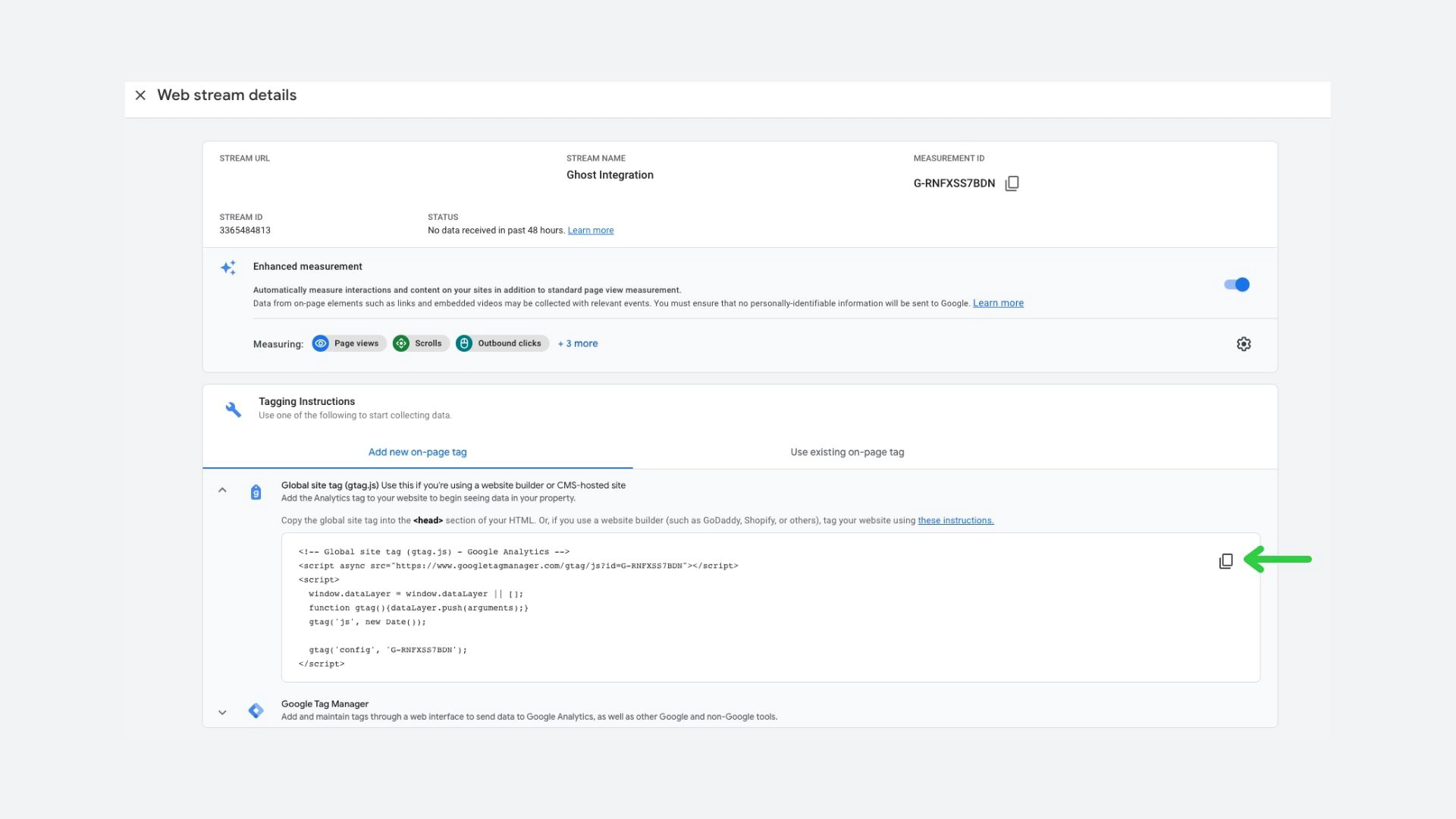Enter the URL for your website (like demo.ghost.io) and a stream name (like “My Ghost Site”). Choose the options you want to enable and click Create stream.