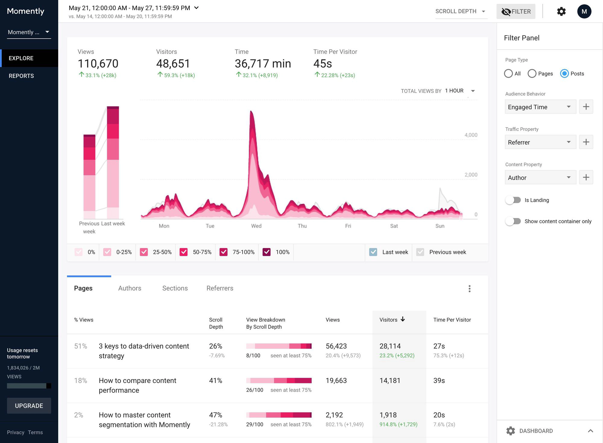 That’s it! Your site is now fully integrated with Momently and you can review your site metrics on the Momently content dashboard at any time! Here’s an example of a Momently dashboard: