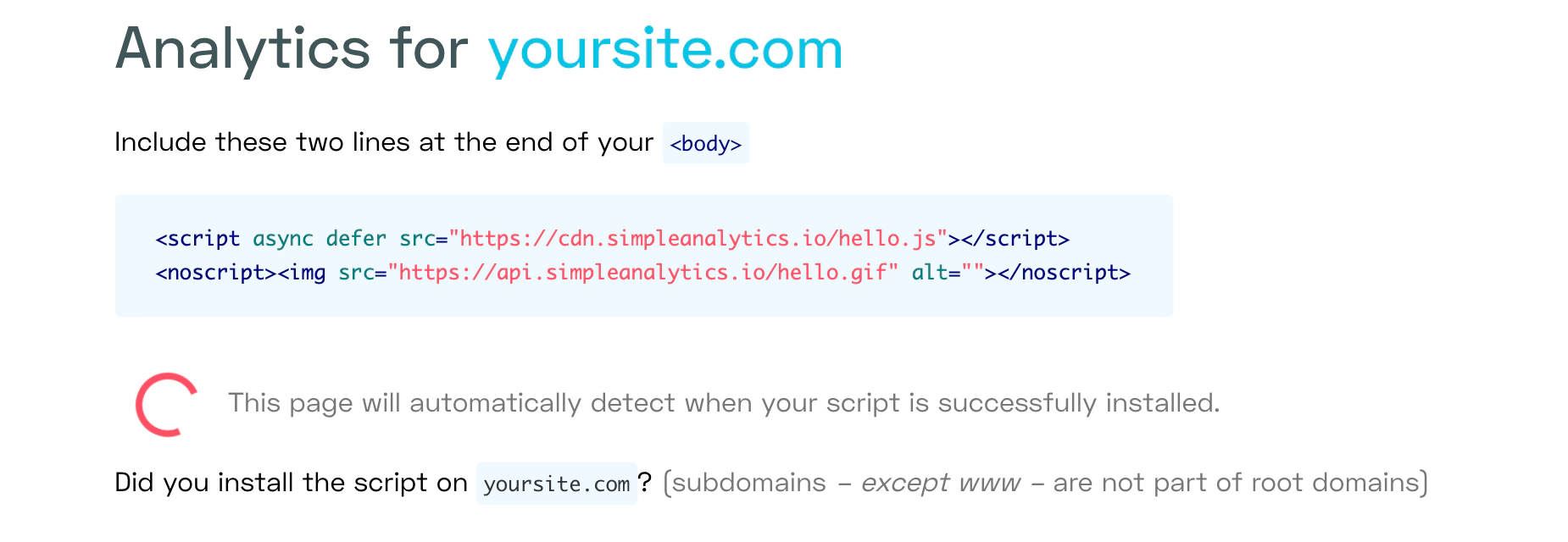 Simple Analytics requires the tracking code to be in the <body> of each page on your site, so paste it into the Footer section and hit save.